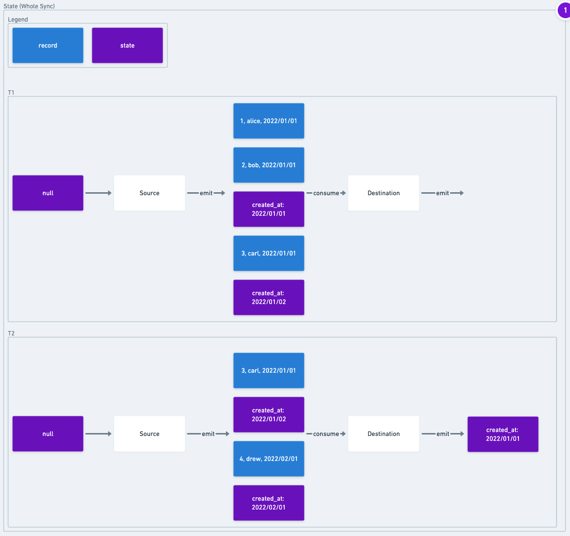 3. state - A JSON object that represents a checkpoint in the replication. This object is only ever written or read by the source, so it is a JSON blob with whatever information is necessary to keep track of how much of the data source has already been read (learn more in the State & Checkpointing Section).